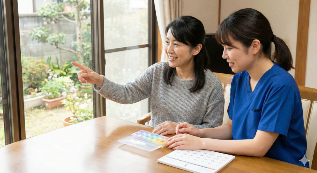 看護師が1日の流れを一緒に見直し、服薬時間を生活リズムに合わせて再設計。